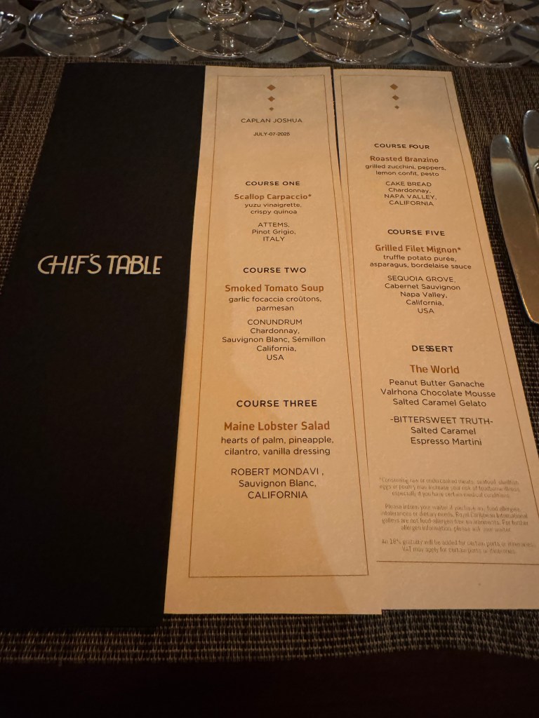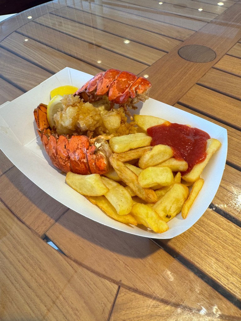 The next day, back at sea, was slow and sweet. The kids roller-skated, then we had lunch in the main dining room. Shivani and the boys rested while I chilled in Two70. That evening, I tried the fried lobster tail from Fish & Ships. It was okay — lobster is always good, fried food is always fun, but frying lobster feels like gilding the lily. Try it once for the experience. But if you’re a lobster purist, seek out something simpler.